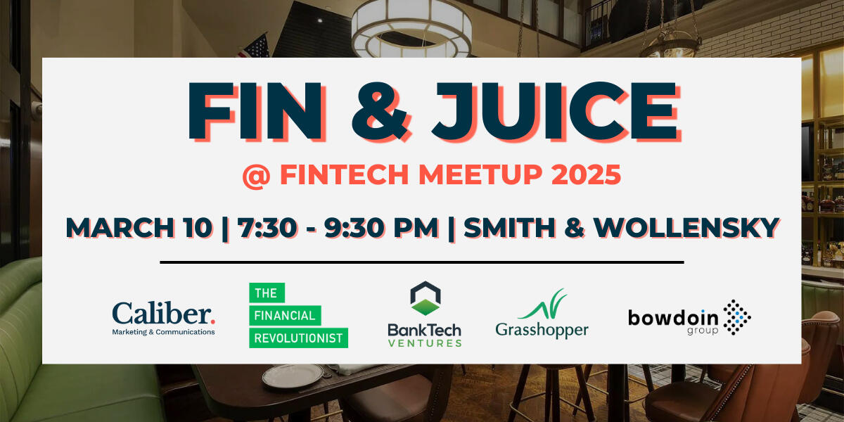 | Fin & Juice | Caliber, BankTech Ventures, Grasshopper, Bowdoin, The Financial Revolutionist | 7:30-9:30pm | Smith & Wollensky | Request an invite |